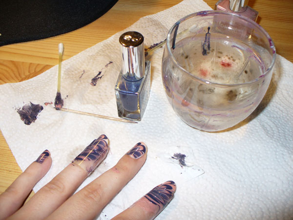 Still, it's the best so far. Another 5 tries and I might get there! I took the pictures now, with artificial light and flash, because I'm not sure how long the mani will survive. I'm tempted do add glitter. That may or may not prove a mistake. Sorry for the mess, I haven't finished cleaning up yet. Water marble is a really messy business.